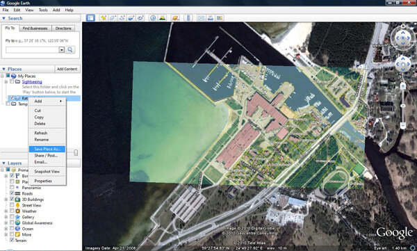 Google Earth programmi vasakul poolel parem hiire klik oma kohandatud kaardil.