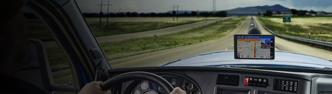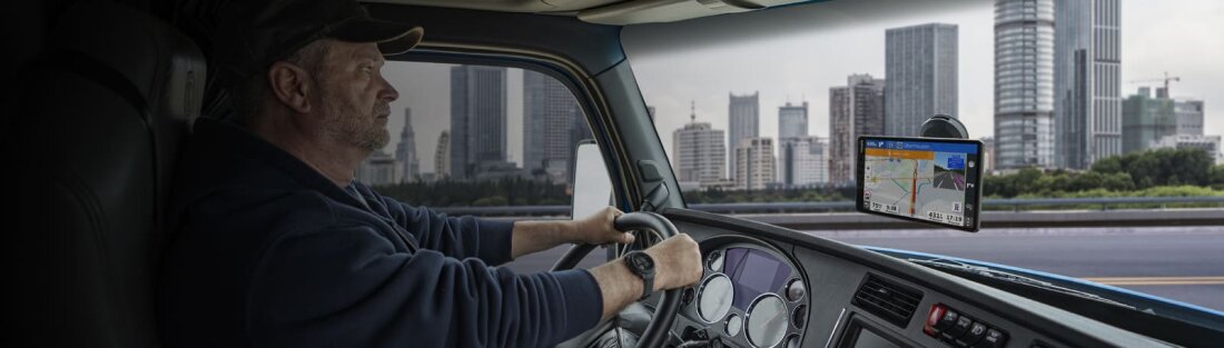 | An extra-large 10″ touchscreen display provides a crisp high-resolution image. Select landscape or portrait view to suit your in-cab setup. | Just enter your truck profile (customisable by height, weight, length, width and hazardous materials) to find truck-preferred routes1 best suited for your truck and load. | BirdsEye Satellite Imagery makes arrival planning run smoothly with aerial views of loading docks, truck entrances and security gates. |