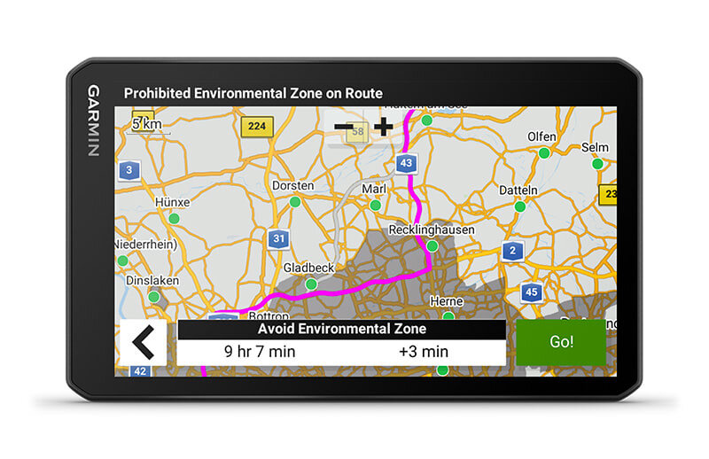 | Get guidance and warning about Environmental Zones on your route. | Need to park your truck? Truck Parking Europe data helps you locate truck parking along your route. Filter by preferred amenities such as Wi-Fi®, showers, security level and much more. And while connected with the Garmin dēzl™ mobile app, check on parking availability to reduce the risk of driving to a crowded place. | Locate preferred truck stops with the preloaded directory of Truck & Trailer Services. It lets you filter listings by brand or amenity. |