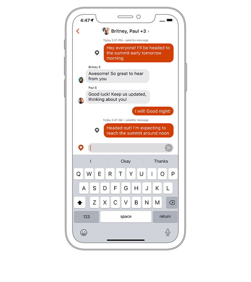 | Lihtne kasutajaliides rakenduses Garmin Messenger muudab sinu nutitelefoniga satelliit- või mobiilsidevõrkude kaudu sulle kallite inimestega tekstsõnumite vahetamise lihtsaks. | Optimeeritud inReach sõnumside kasutab võimaluse korral sinu nutitelefoni mobiilsidevõrku ja lülitub automaatselt ümber 100% ülemaailmsesse Iridium® satelliitvõrku, kui oled mobiilside levialast väljas. | Rakendusega Garmin Messenger toetan sinu inReach rühmasõnumite saatmist. Seega saad jagada oma seikluseid korraga mitme kontaktiga ja pidada sõprade ja perekonnaga rühmavestluseid. |