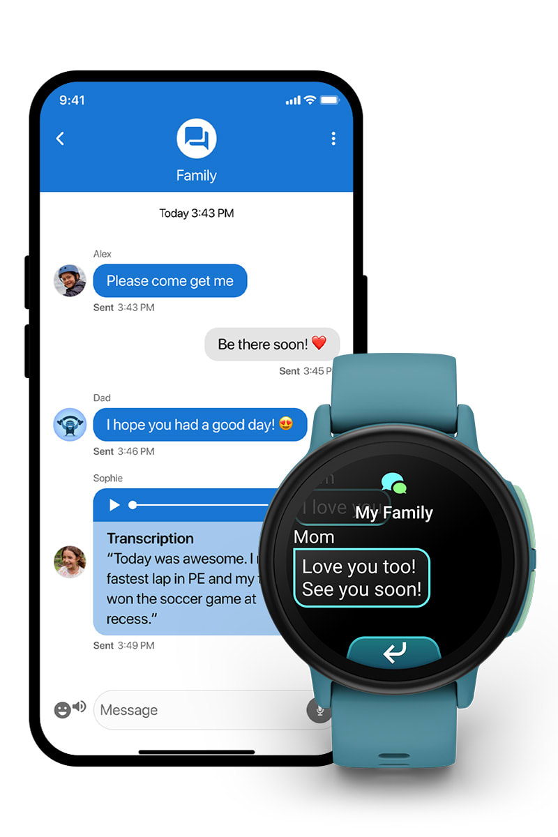 | Vaata oma lapse asukohta nutitelefoni rakenduses Garmin Jr.™ ja saa teavitusi, kui laps lahkub vanema määratud alalt või siseneb sinna. Võid isegi seadistada teavituse lapse lahkumise kohta sealt, kus ta parasjagu on. | Kasuta rakendust Garmin Jr. helistamiseks su lapse seadmele Bounce1 ning häälsõnumite saatmiseks ja vastuvõtmiseks. Samuti saad vastu võtta häälsõnumeid ümberkirjutusega. | Kehtiva tellimuse olemasolul võid kasutada rakendust Garmin Jr. tekstsõnumite saatmiseks oma lapse nutikella Bounce 2. Lapsed saavad luua oma sõnumeid ja vastata täisklaviatuuri abil seadmes, sealhulgas emotikonide ning heliga emotikonidega, vanemate heakskiidetud kontaktidele ja pere rühmasõnumites. |